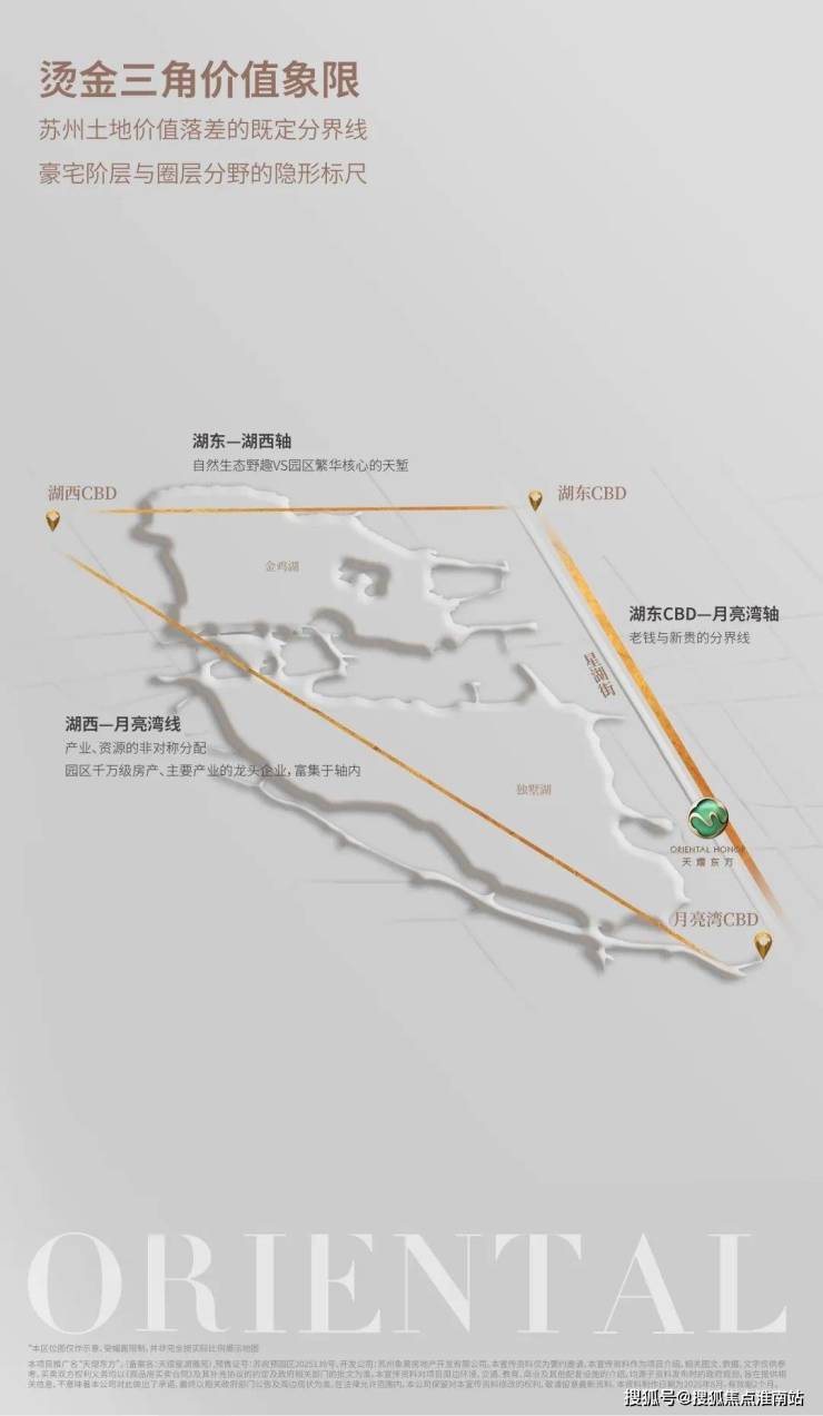 黄金三角的三条边,是苏州城市价值的等高线,更是圈层分野的隐形标尺。湖东—湖西轴如同园区“长安街”,串联东方之门到国际博览中心,南北一轴之隔便有千万价差鸿沟;湖东CBD—月亮湾轴沿星湖街延伸,轴内代表老牌权贵与金融资本,越近双湖资产越保值;湖西—月亮湾线则是“资源动脉”,串联苏州中心、月亮湾和独墅湖高教区,集中了园区80%的优质资源,轴内外资源呈断层式差距。三角之内是苏州豪门俱乐部,三角之外仅是高端改善,天熠东方正处大双湖CBD的C位,占据着无可复制的核心地段。