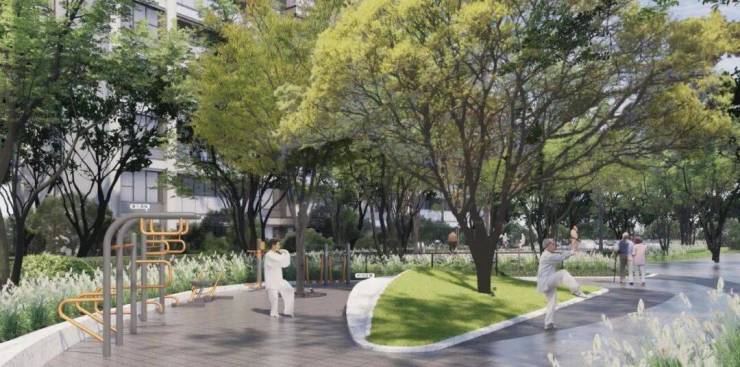 这条生态水岸总绿化面积达到了200万方,包含庭院式绿化、市民公园、慢行系统等功能