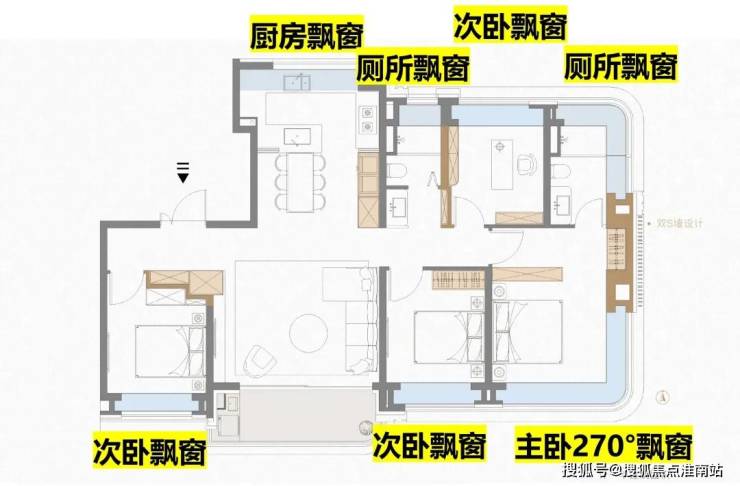 看一下它建面139㎡的户型,直接做出了7个飘窗,边套主卧两面还做出了270°飘窗(建面107㎡3房,建面约128-139㎡4房都有)。粗略估算一下,这三个户型飘窗面积应该有10+㎡。