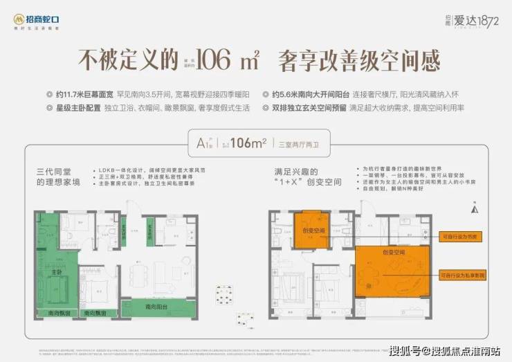 与常见的中间套户型不同,招商爱达1872的约106㎡,南向有3.5开间,面宽约有11.7米。如此一来,可以将更多南向开间面,留给餐客厅,同时外接约5.6米长的南阳台,让公区显得更为阔绰。