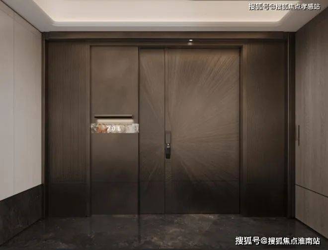 比如入户大门配备大面积的 金属格栅、局部莫奈奢石。