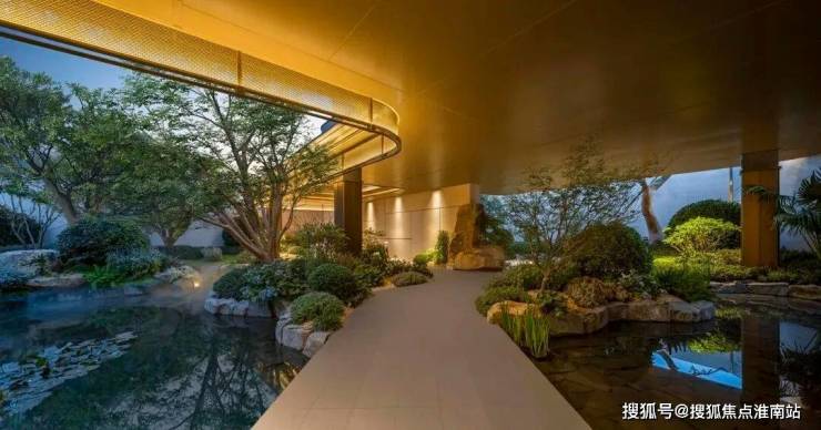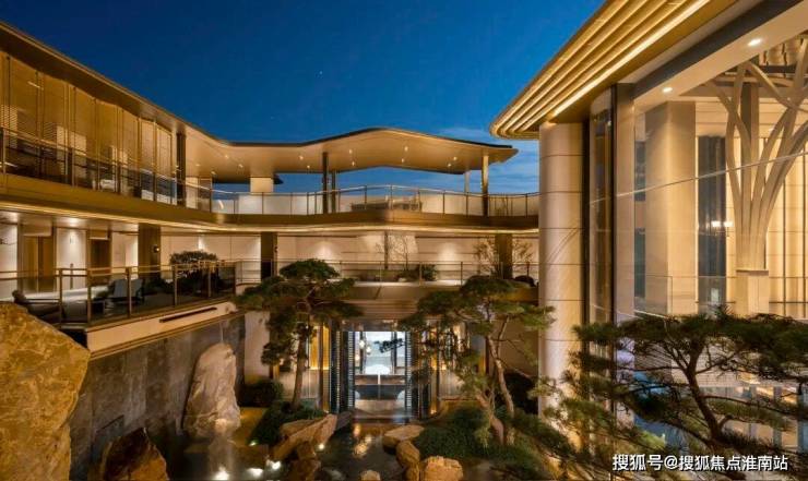 景观以「四境四巷」铺陈东方礼序,「五重归家」轴线串联宽约128米恢弘门庭、约15米叠石飞瀑、约13米榫卯转译的现代穹顶等。约1300㎡下沉式庭院采用三层立体观景设计,15米叠石飞瀑再现《溪山行旅图》的山水意境。