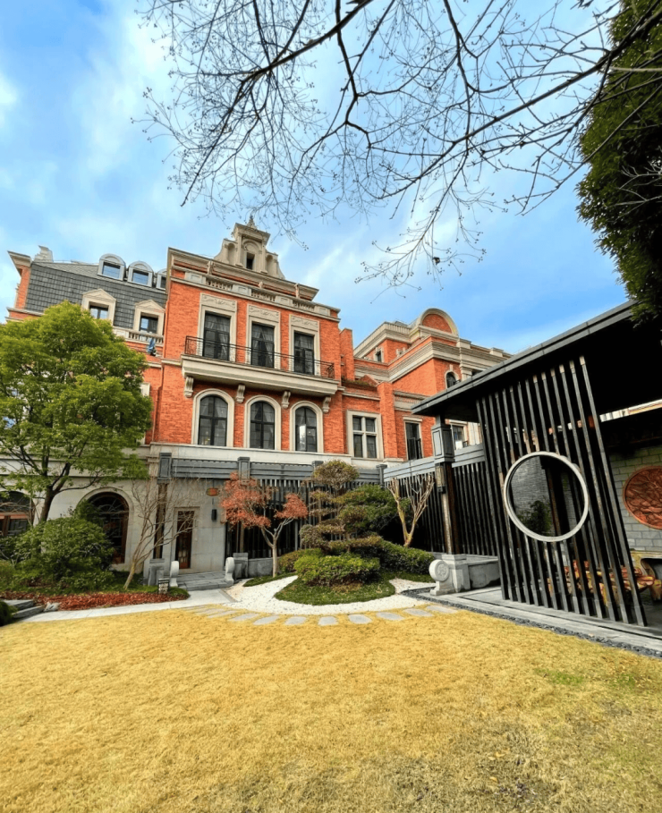 海派建筑风格与品质:项目由5栋海派洋房建筑组成,致敬衡山路老别墅风范,融合东方美学与现代居住理念;外立面采用优质石材与金属线条,大堂挑高约18米,尽显高端大气