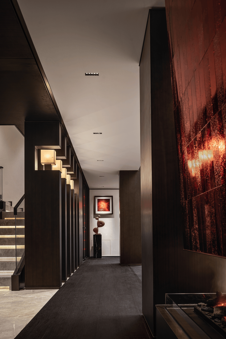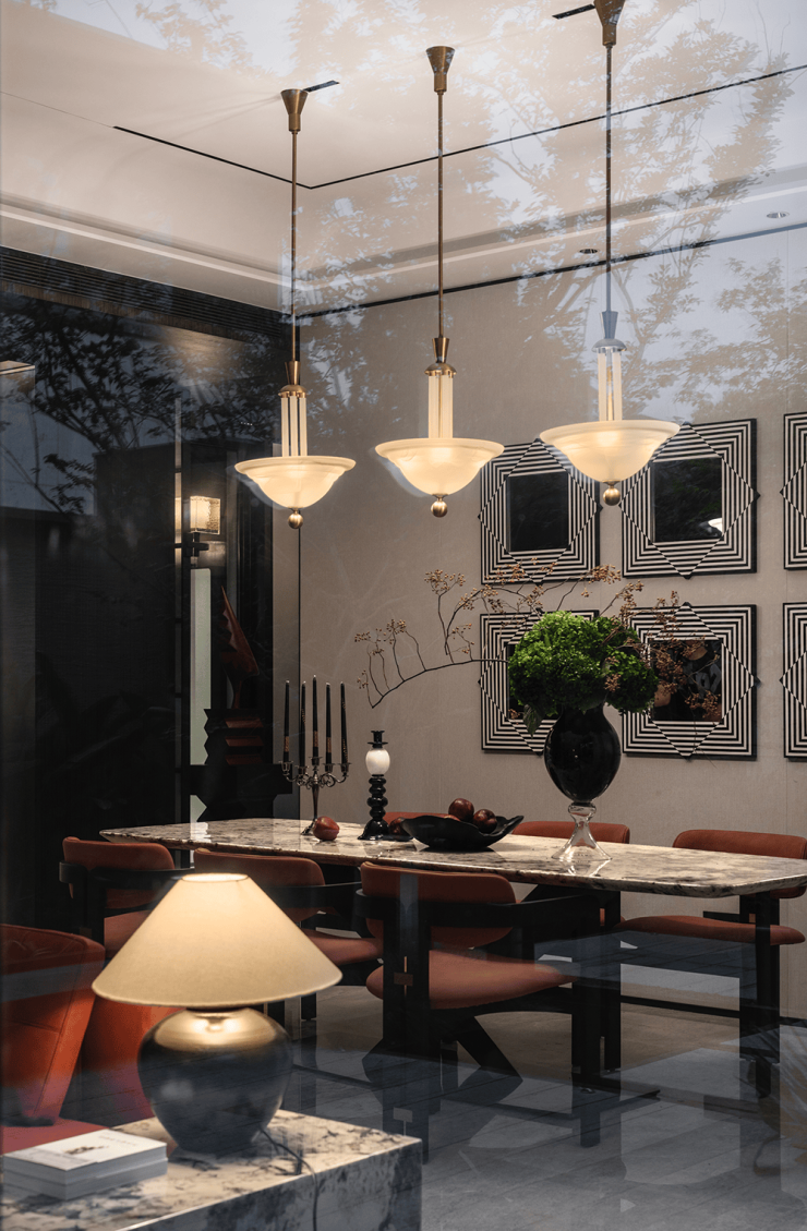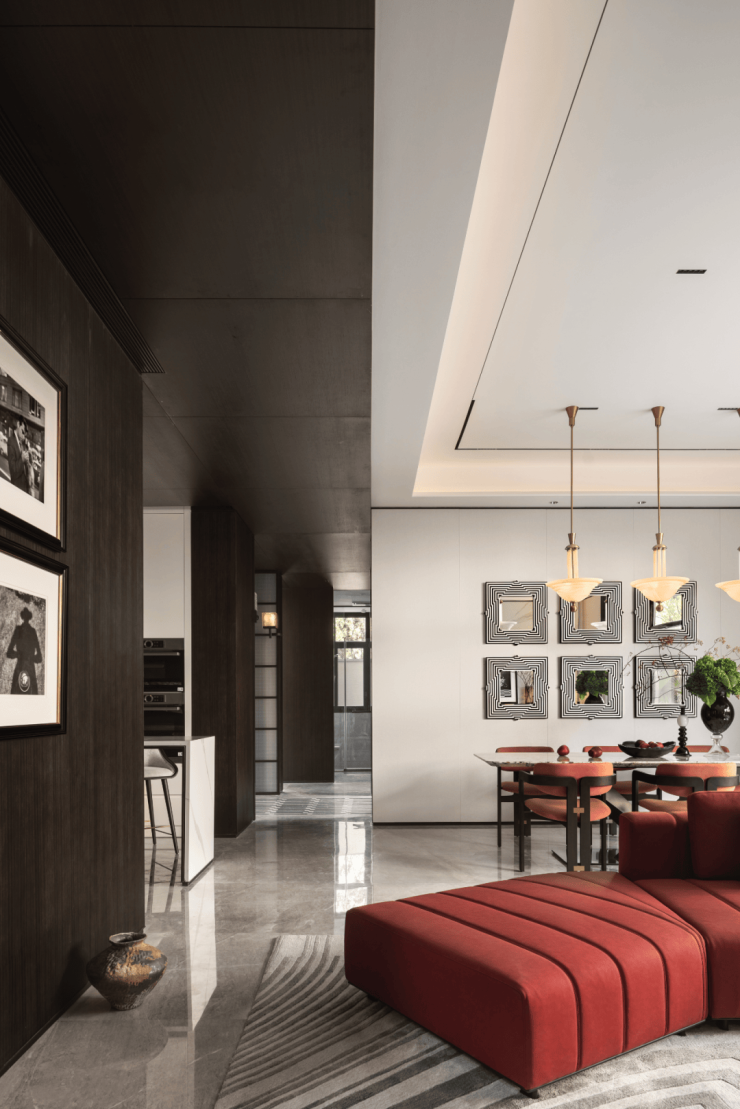 一层的平面是「曲尺型」的布局,客餐厅之间以游廊相连,客厅与餐厅以斜45°角的对望关系存在, 中间以内庭水景相隔,巧妙地解决了室内与室外之间的渗透关系。它能带给你心灵上的自由、行动上的自由,这才是真正住别墅的一种意义。