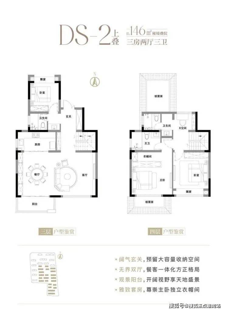 约146平三房上叠,同样拥有大横厅设计,附赠约25平阁楼,独享宽景露台。