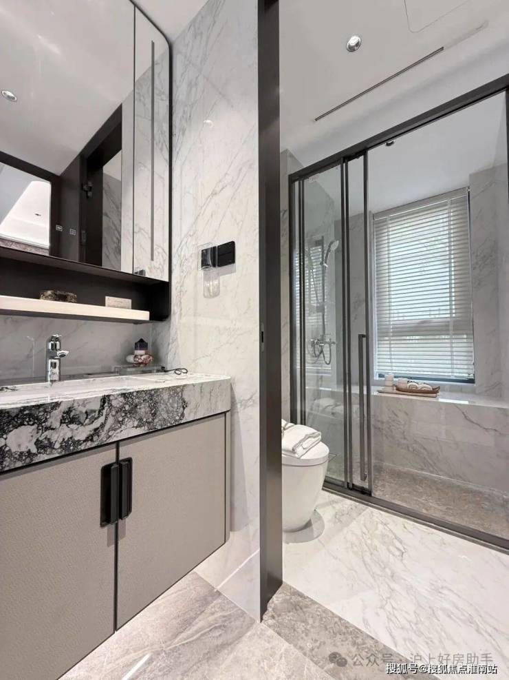 奢石台面,皮革饰面柜抽屉,侧端设置金属收纳开放格;定制镜柜,中间的透光玉石直接提升了高级感,镜柜内部配备了美妆冰箱+美妆灯条+轨道收纳!