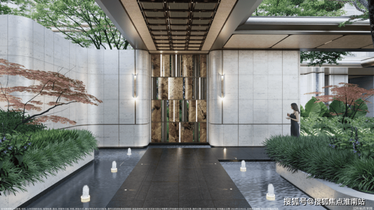在门庭外,辅以两侧具有仪式感的跳泉水景,将建筑的圆弧美感与自然水景相合,共同构成海上·清和玺“贵雅清和”的城市界面。