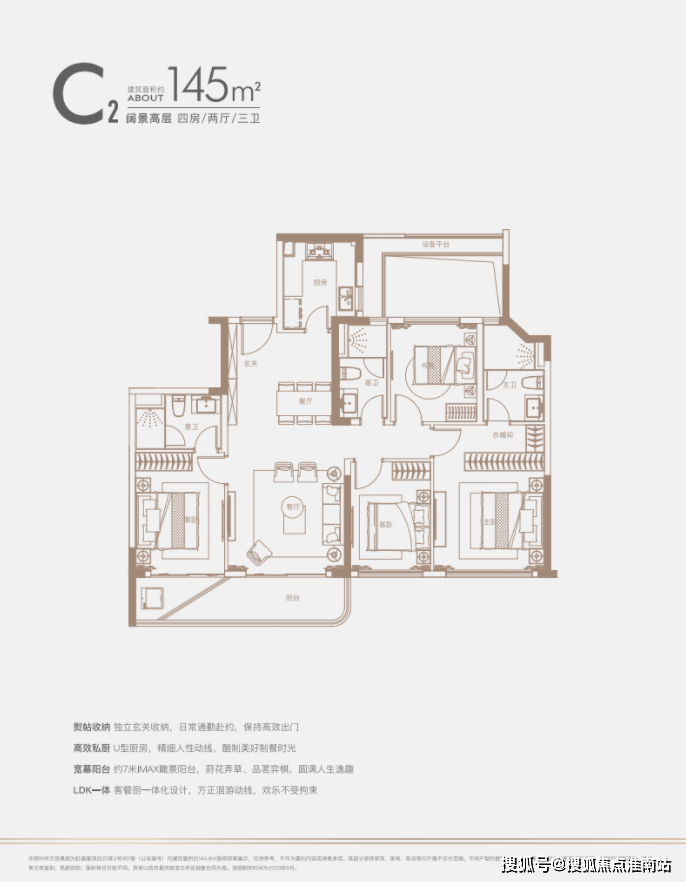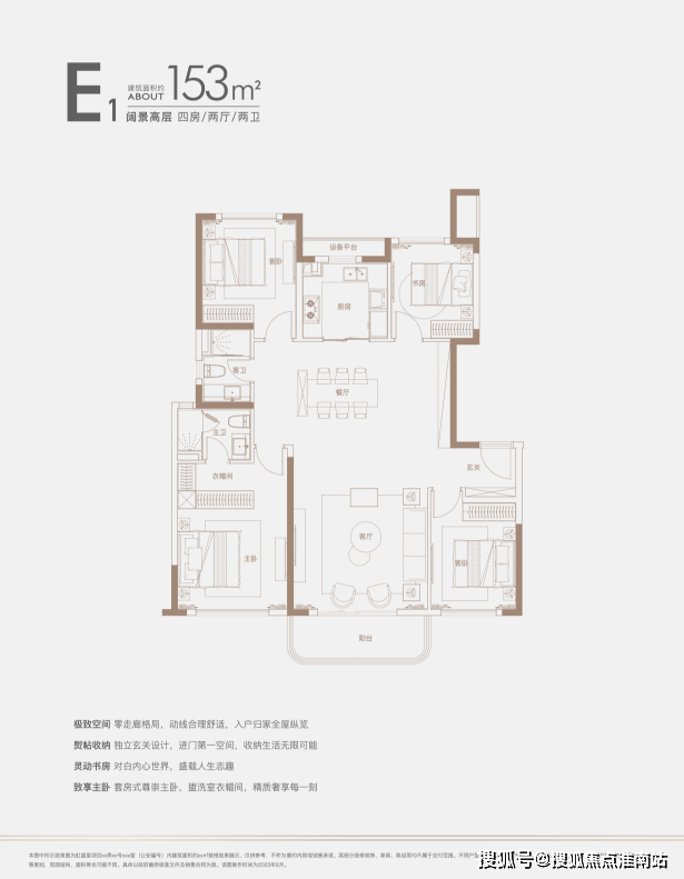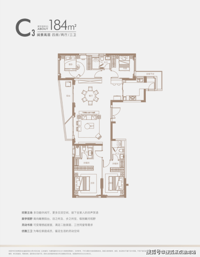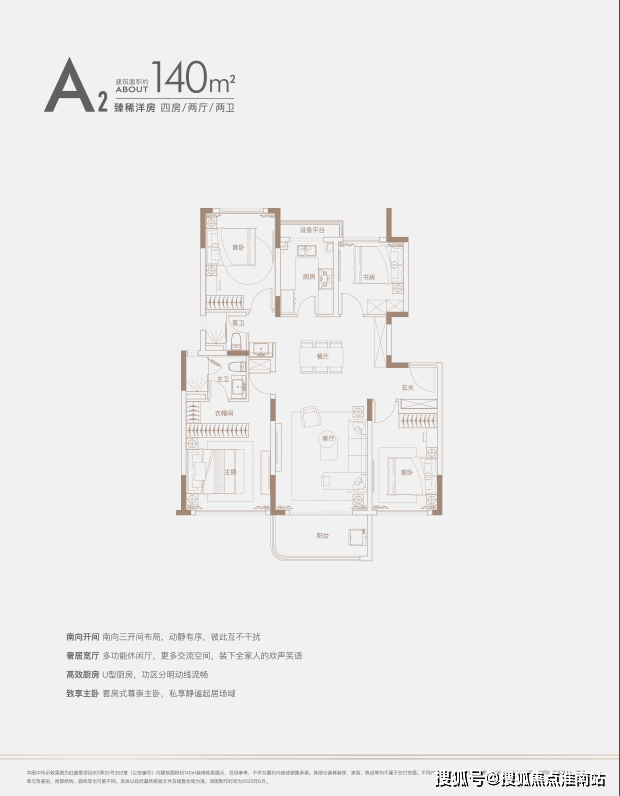 建面约140㎡四房:三开间朝南户型,南北通透,采光条件优质,客厅明亮宽敞,彰显大气布局。