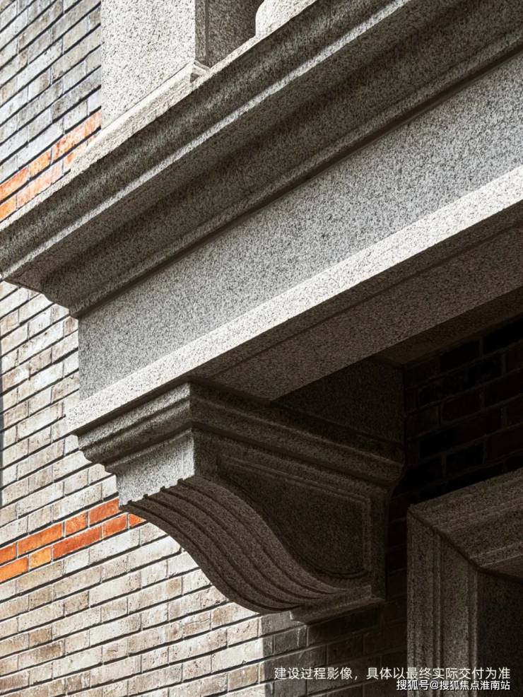 弘安里79号传家大宅的花岗岩石材山墙,从经典的“人形”山墙改良而来,等腰三角极简廓形,山尖以回纹装饰,两端以组合墀头收尾,立体层次造型端庄典雅。当夕阳为山花镀上金边,建筑的边缘随即框住流动的光晖。