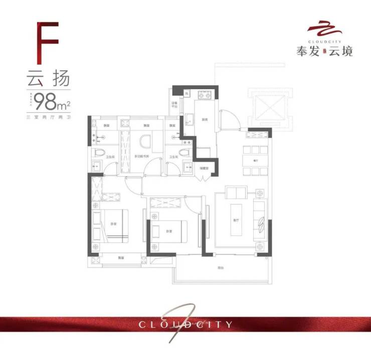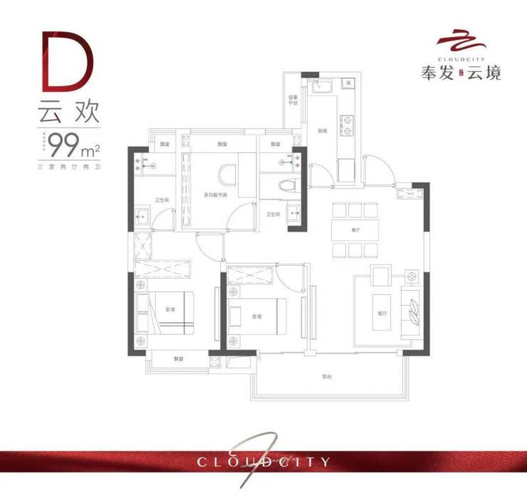 主力户型:98㎡、99㎡三房,三开间朝南,大面宽阳台,主卧带卫