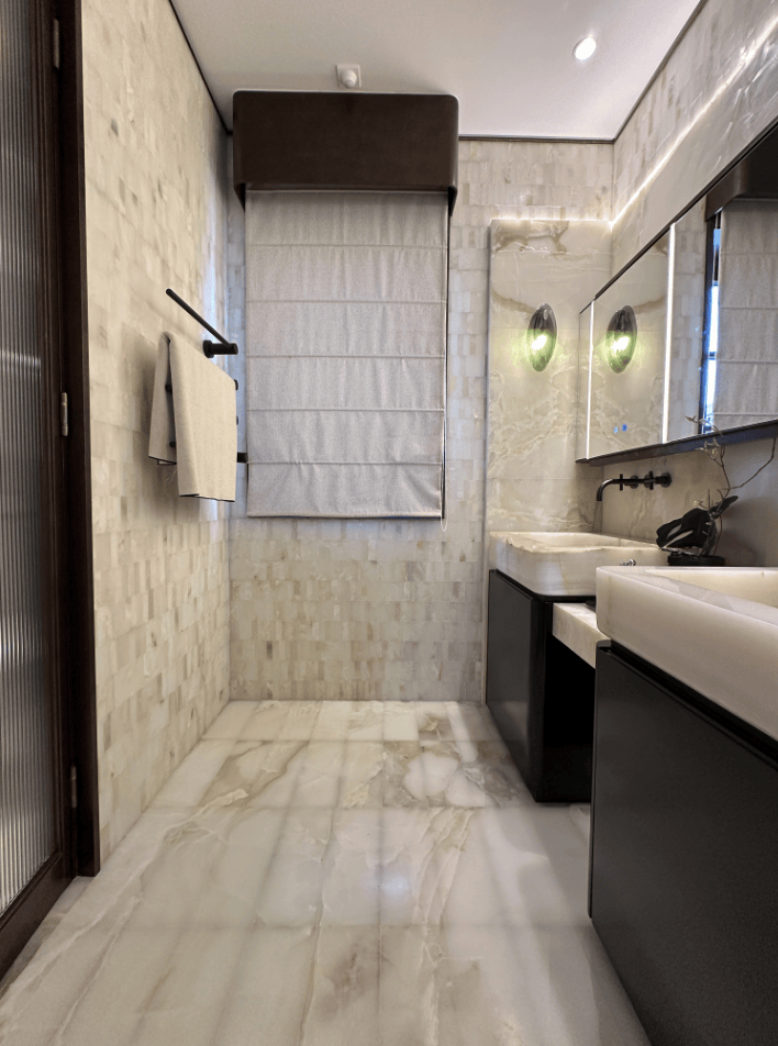 而样板间里这第二个卫浴空间,更接近于享受级。嵌入式浴缸,设计了魔镜系统,可以供业主泡澡时观影娱乐;除此之外,这个卫生间也有独立的淋浴房,并设计有桑拿房。