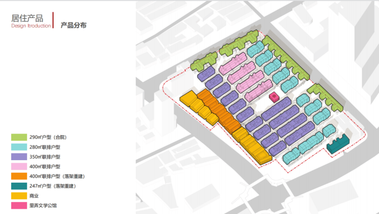 项目总可售面积约4万㎡,包含121套可售低密住宅, 产品面积段为245-758㎡,产品涵盖1-3 层的里弄住宅,有天有地有院子,房型以 3-4 房为主, 并规划有满足高净值人群社交圈层需求的多功能会所,是市区少有的里弄风貌别墅。