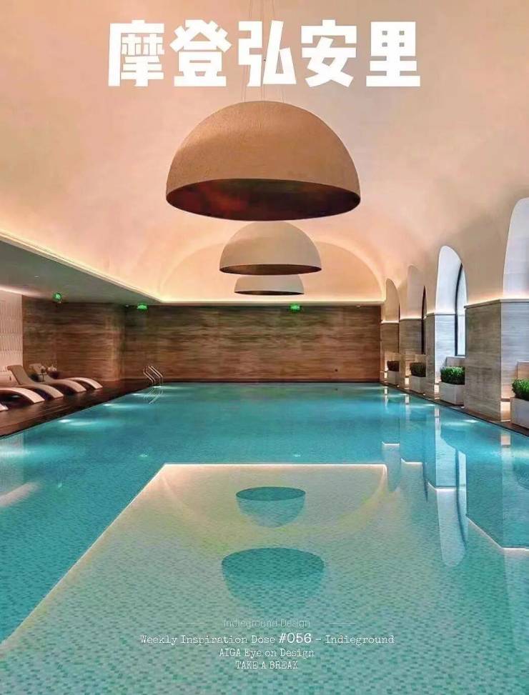整个泳池天花板,呈现出海派拱形元素,落地玻璃窗外,是下沉式的景观空间: