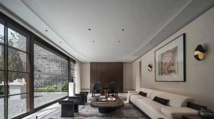 整体一层空间的东南方向,样板间设计为了茶室,配合西向落地玻璃窗,同样正对庭院。