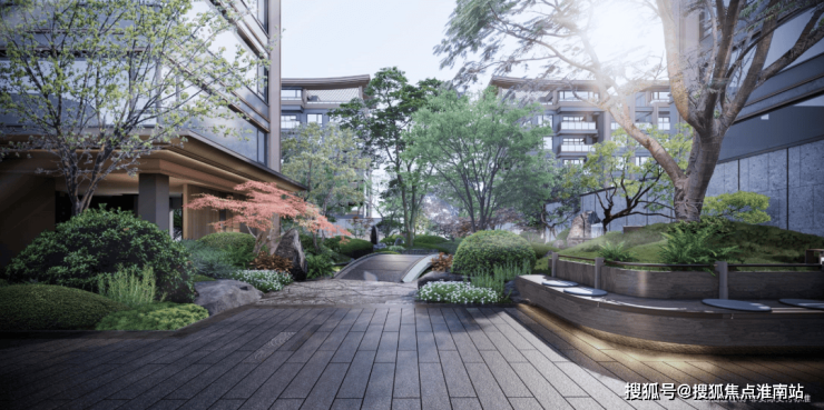 雅致石院与中庭古树相映建发朗玥售楼处电话:400-998-9694 植物组团错落有致,营造出清逸山水园林之美,唤醒人们对林荫树下休憩闲聚的场地记忆。