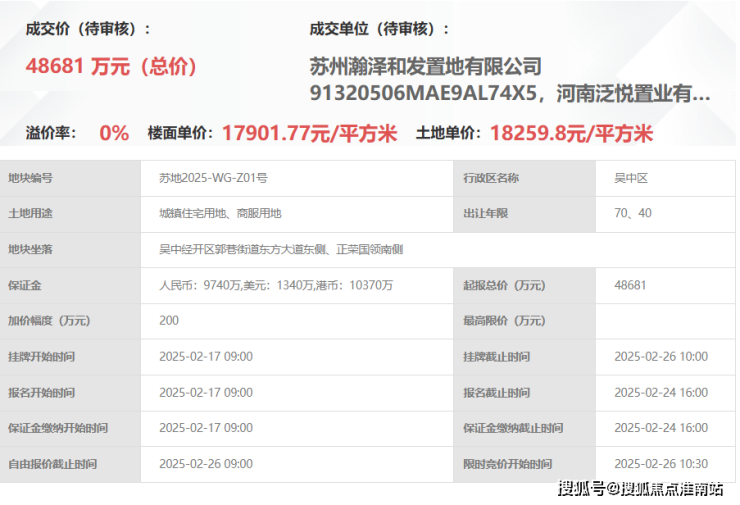 独墅湖西商住用地,由瀚泽和发、河南泛悦底价拿下,成交总价4.87亿元,成交楼面价17901元/㎡。