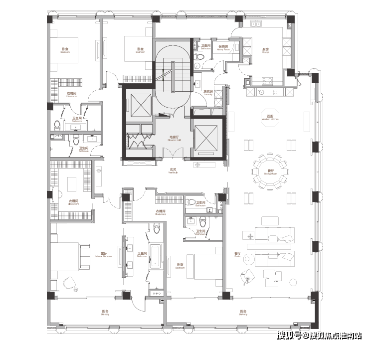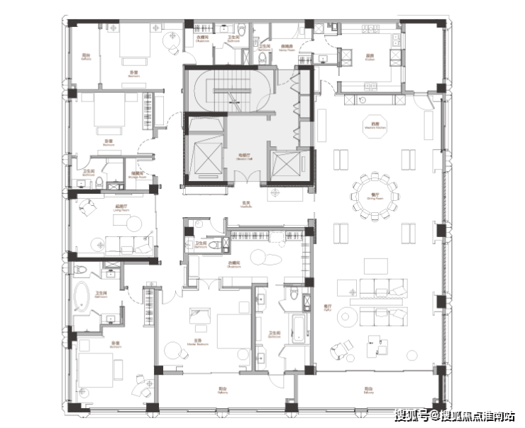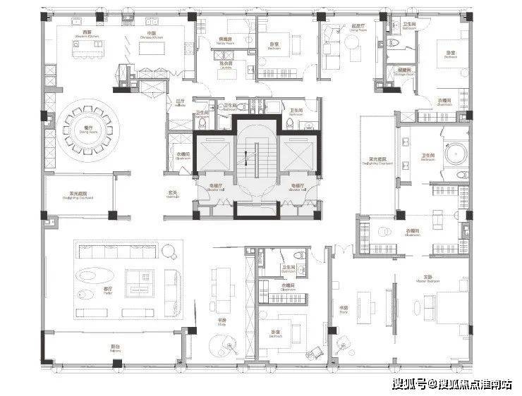 一期可售的户型面积集中在458-641㎡。当风貌平层户型尺度做到这个层面,其实户型本身已经无可挑剔了。仅说个细节,一期风貌平层中,做了罕见的做了两梯一户配置,主佣分离很好地保证了业主的隐私性和动线。