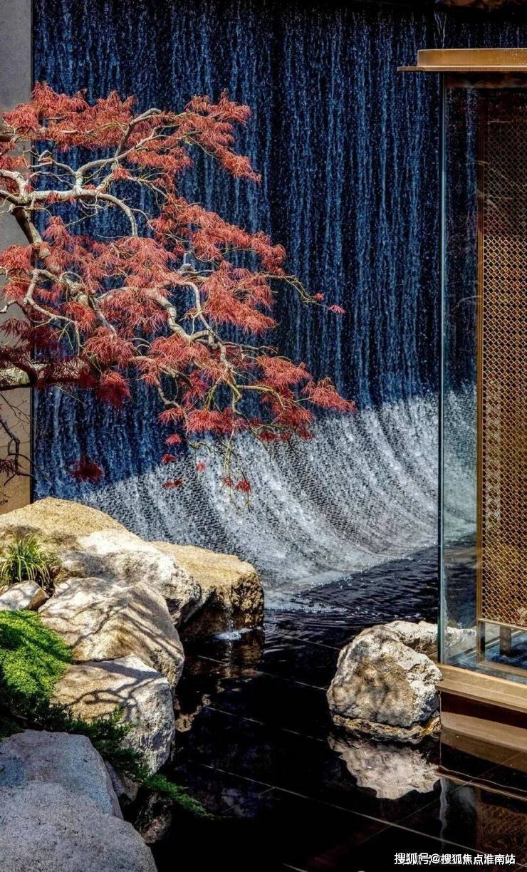山水庭院汲取《足立美术馆》的造境手法,以老石皮、百年古木原样搬运,重现山间岁月的自然痕迹,与庭院中的光影交织,仿佛将山间的自然采光与静谧之感搬入城市。阳光透过树梢洒落,石皮上的纹理在光影中若隐若现,宛如一幅流动的自然山水画卷。