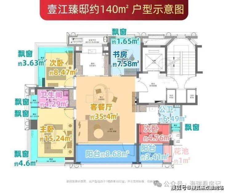 建面约120㎡户型通过6个飘窗、2个南向阳台(赠送一半面积)及独享约5㎡电梯厅,整体赠送面积约18.5㎡;