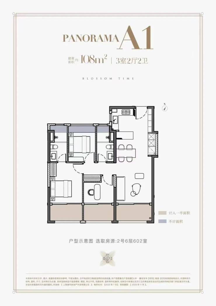 主力户型建面约108–123㎡,主打3–4房改善型产品,全系标配“三阳台”设计,得房率高达87%–96%:
