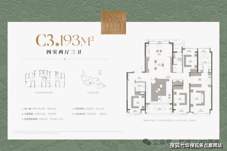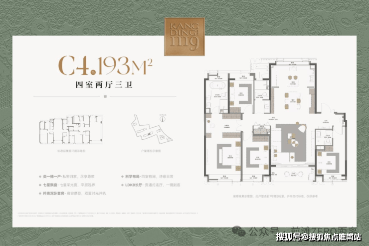 建面约 177-183㎡四房:项目主力户型,采用 LDKB 一体化横厅设计,部分配备双套房,得房率高达 89.6%。