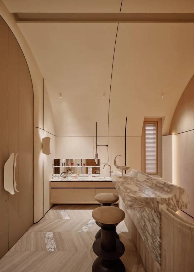 顶层专属于主卧,推开双开门,拱形天花设计尽显浪漫,挑高至3.8米,一条长灯带自浴室贯穿至整个卧房,分置于灯带两侧的弧形结构,环抱出一份安心。而其床头背板也被设计成拥抱的视效,为空间增添温暖包裹的氛围。