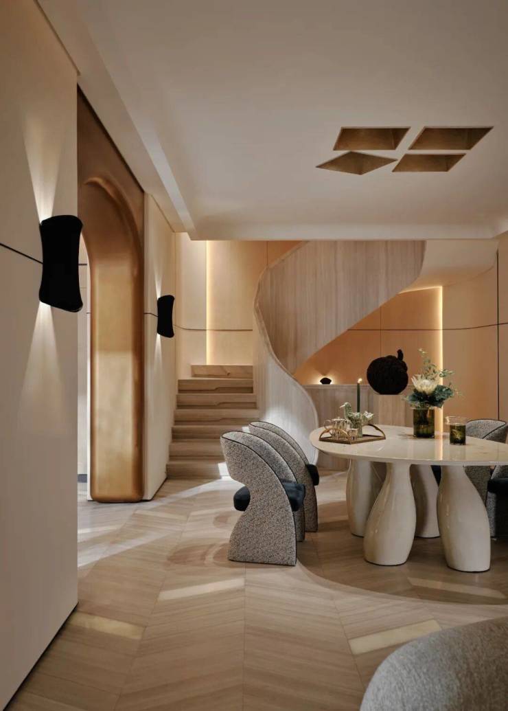 顺着弧形木质楼梯抵达地下空间,仿佛游走在一曲流动的乐章中。一切都共同呼应着水的特质,传递着低调隐逸情怀与圆融个性。