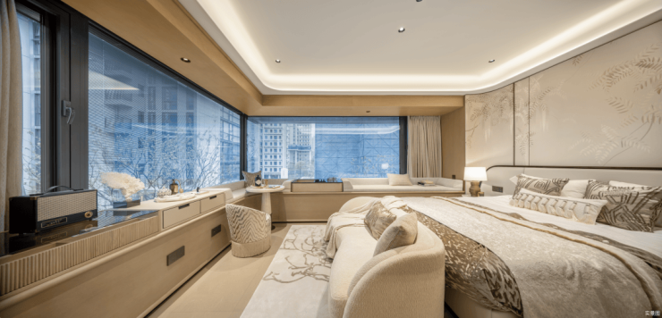 主卧拥有 270度环幕飘窗, 视野和采光优越,配备了高奢卫生间,空间感、尊崇感拉到顶格。