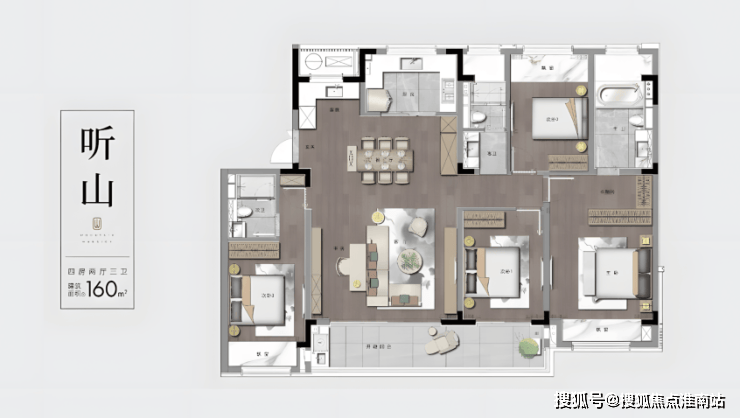 主力户型均配置双阳台系统——南向景观阳台连接自然,并搭配全景飘窗设计,极大提升采光面与视觉通透感。例如建筑面积约143平方米的户型,实现了四开间朝南,5.3米宽厅连接阳台,引景入室,光明盈户。