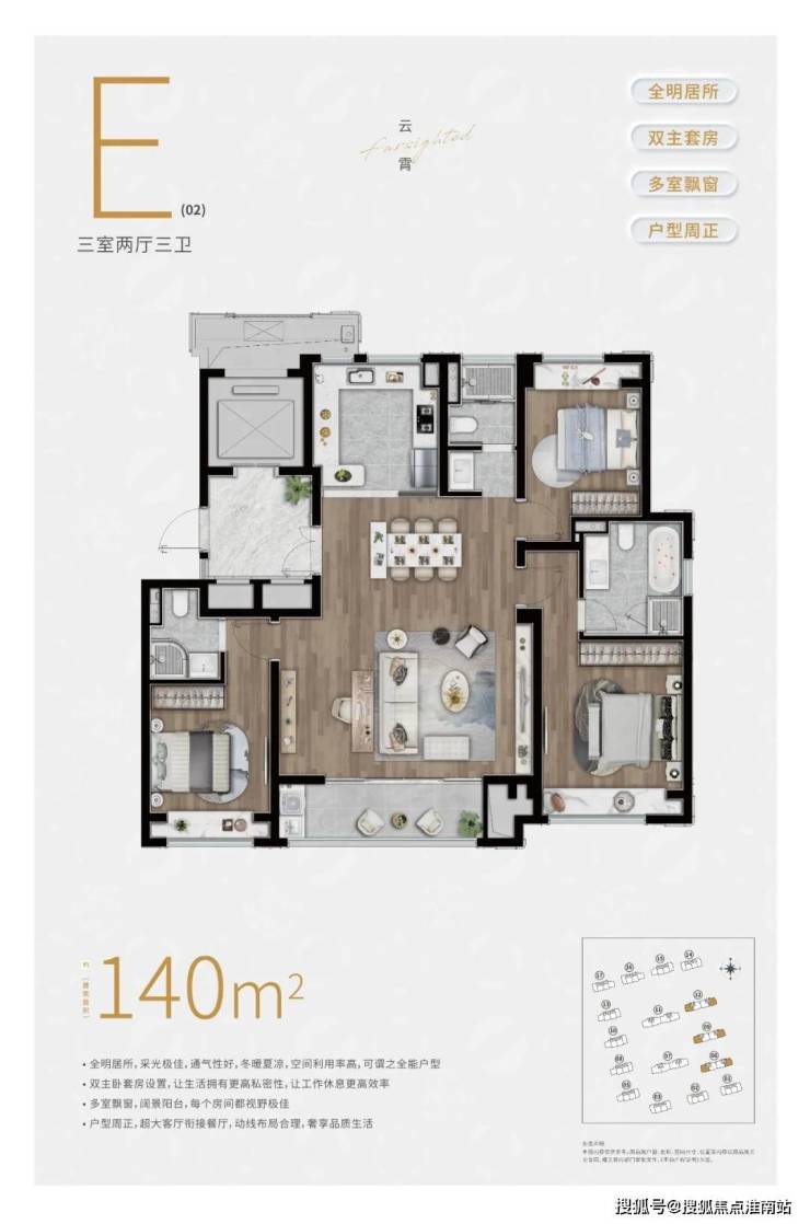 约98㎡3房2卫户型,三开间朝南,并且这贯穿客厅+次卧的超大阳台实在是惹眼,这个南向的视野延展度以及采光度相比同级别的户型来说,要更加出色。