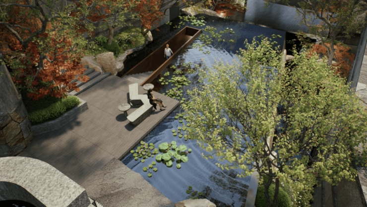 建筑形态灵活布局,通过多元朝向与地形景观呼应,营造出有机而有序的内部空间。这种虚实相生的手法,不仅体现在建筑形态上,更融入生活场景,让人与环境的互动成为一种日常。月恒宫和日昇台在项目的南侧,依托地形展开,打造一个轻松浪漫的氛围,对标与希腊安曼卓熠酒店的空间方式,抬升建筑空间形成立体院落的游园空间。北侧的云溪阁顺应高差悬浮于入口,化解高差的同时,形成了独特的空间。贯穿南北的溪谷主轴,把两侧的合院与叠墅紧密联系,也实现了从莫奈花园到东方秘境的过渡。三个生活场域的打造,以及丰富的庭院街巷空间,为实现园区高品质的生活提供了动人的场所。