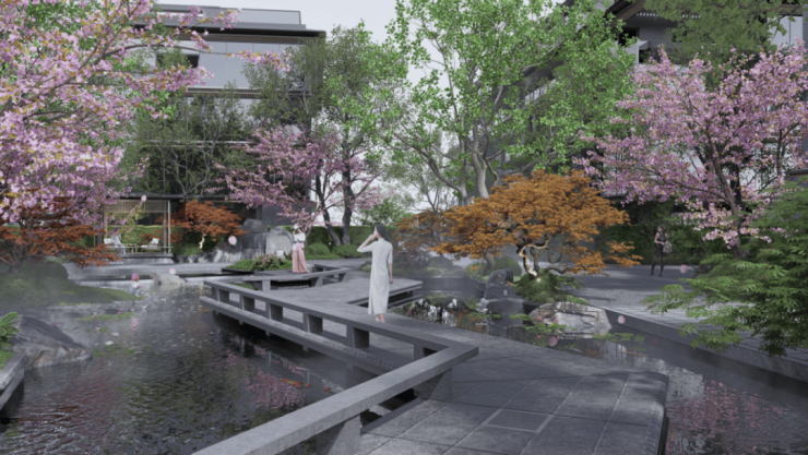 项目结合地形设计,融合莫奈花园与东方园林元素,打造生态居住空间;引入海绵城市技术,通过雨水花园、生态草沟实现自然水循环,降低社区水资源消耗;建筑采用高效保温隔热外墙、节能门窗与可调式遮阳系统,减少全生命周期能耗。