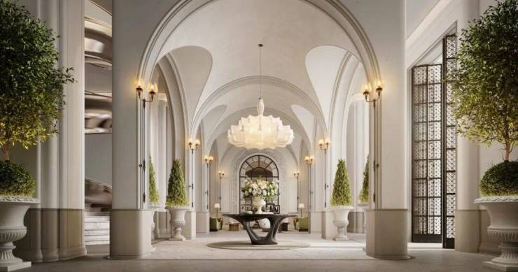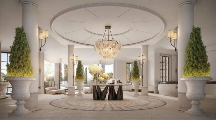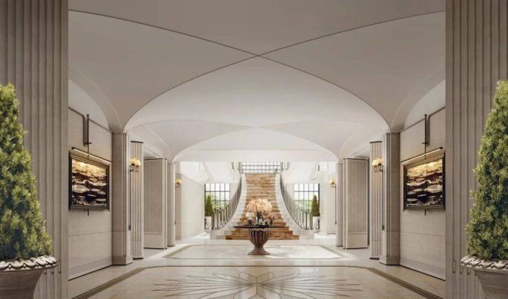 本案公区月恒宫、日昇台,以南法度假风格为基调,运用浅色木纹石石材与特殊艺术涂料与法式GRG线条等材质,营造质朴而优雅的浅弱对比空间。设计汲取地中海度假精髓:开放式廊厅与拱形门洞串联功能区域,营造通透流动的空间体验;精心设计多层次漫射光照,塑造宁静光影氛围;选用天然材质与手工艺制品,构筑温暖质朴的触感体验。