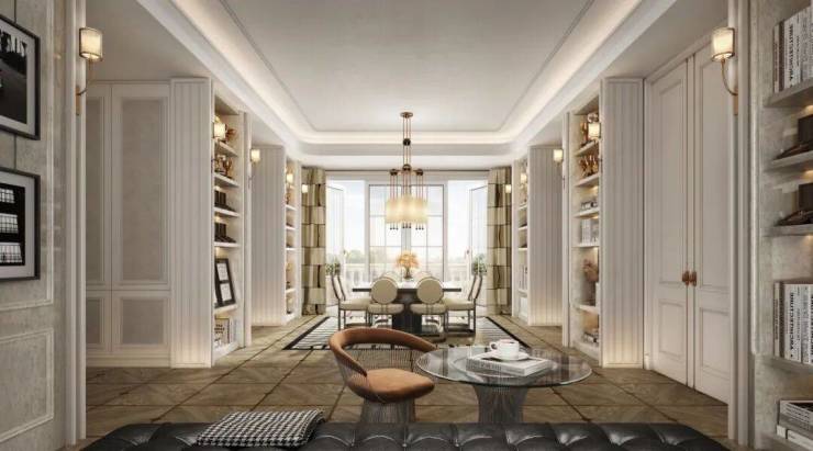 本案为800平方米法式官邸,地下两层打造专属社交空间,配备专业厨房与女王沙龙,营造精致宴请体验。地上三层为家庭生活区,特别设置二层家庭图书馆,构筑文化氛围。