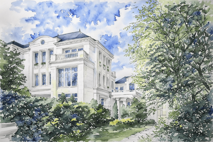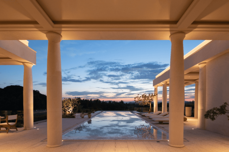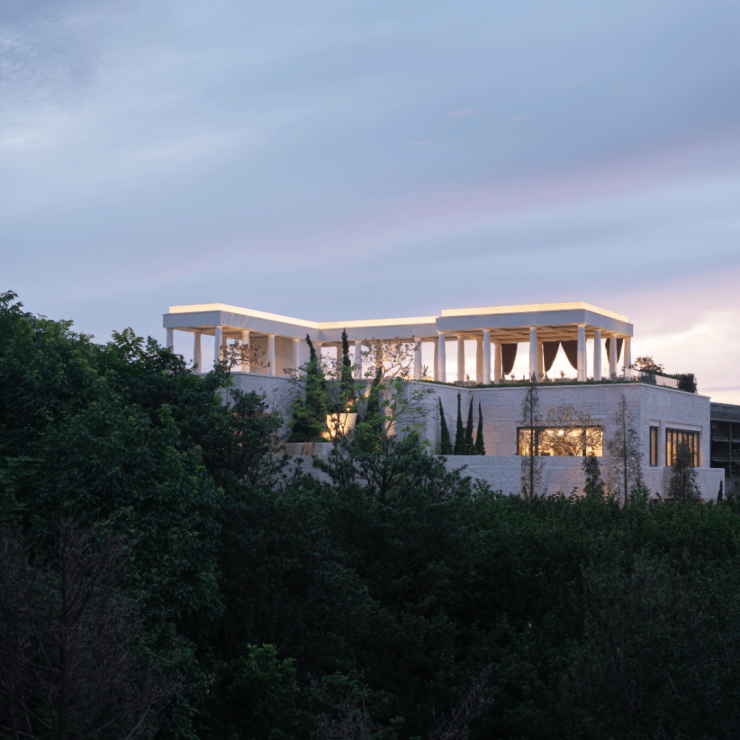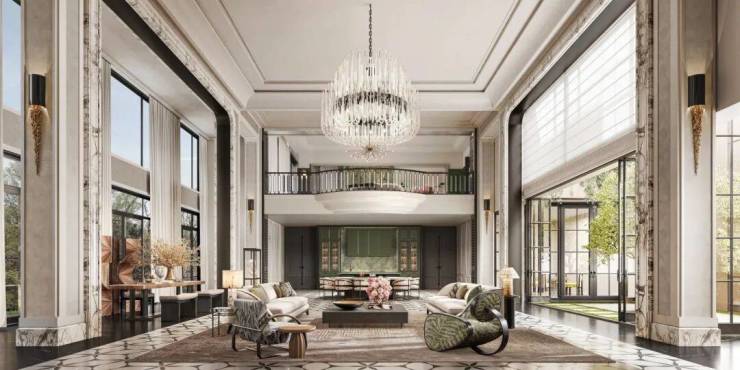 于杭州桃花源板块的深厚积淀之上,推出溪径恒庐,是对法式大宅经典范式的一次深度回溯与创造性转译,项目摒弃了传统宫廷法式的繁复堆砌,转而从现代法兰西优雅生活的典范中汲取灵感。法式合院以香奈儿艺术总监卡尔·拉格斐的蔚蓝海岸私邸 Villa La Vigie的度假气质为精神内核,并提炼凡尔赛华尔道夫酒店立面的经典比例与精工细节。由此凝练的“轻松法式”风格,其精髓在于对经典元素的当代化解构与再诠释。叠墅作为咏溪云庐的迭代,恒庐的叠墅汲取现代东方的元素,强调整体性,大面的开窗给平面功能提供了更多与阳光自然接触的可能性。立面以横向线条为主,形体关系简约清晰,暖灰色的建筑色调与浪漫法式融合得相得益彰。