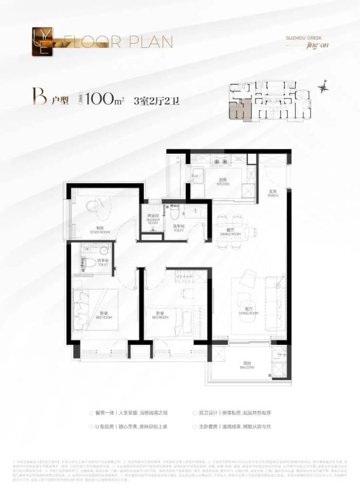 建筑面积约100㎡3房B&C户型:3房功能性符合市场主流需求,三开间朝南的布局保证充足光照。动静分离的设计让安静与活力同在。主卧套房设计,舒适度和私密性双爆表!