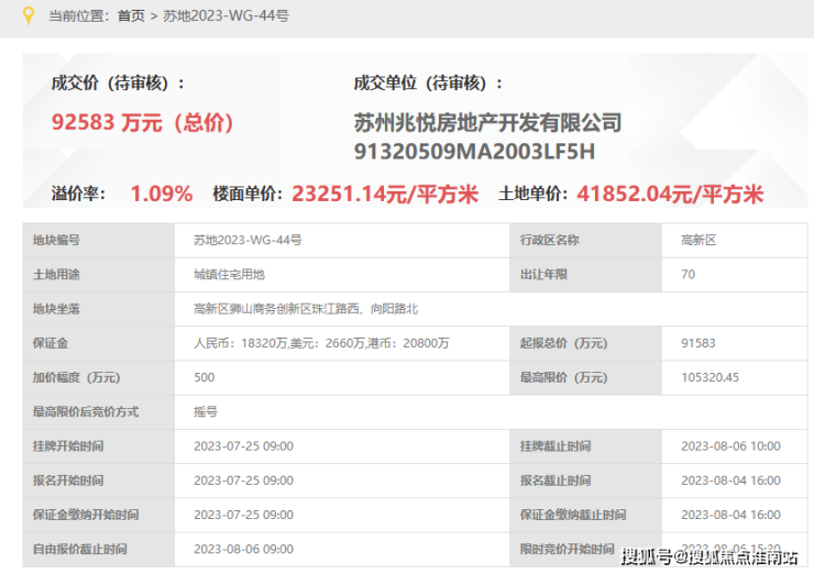 2023年8月6日,建发以总价92583万元竞得,成交楼面价23251元/平,溢价率1.09%。