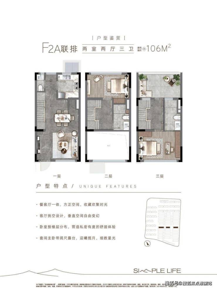 建面约106㎡两室两厅三卫(联排)