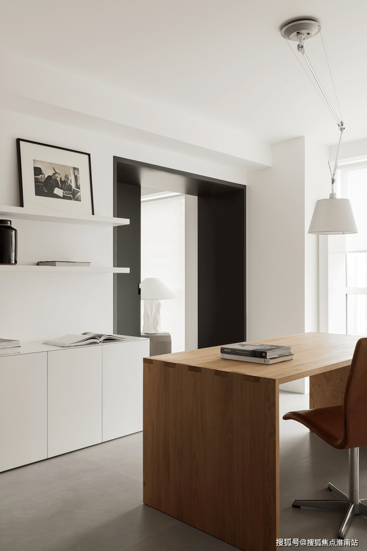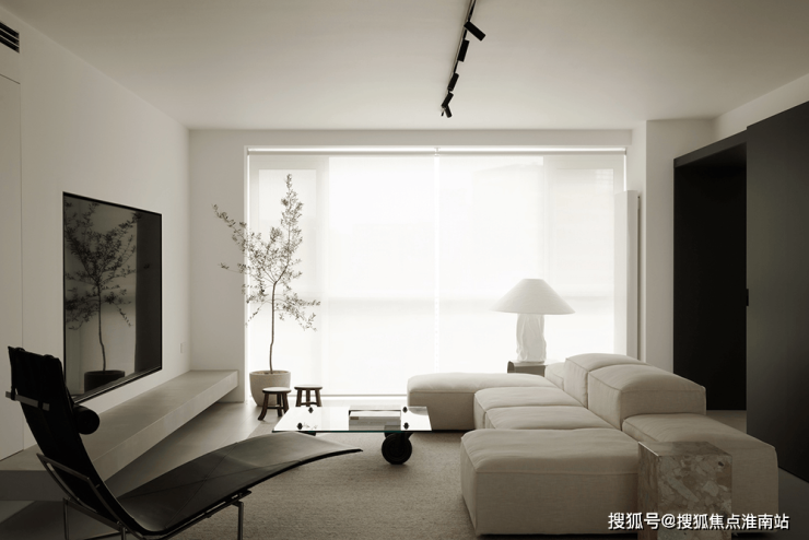 四白落地的墙面,浅灰色混凝土地坪和无主灯设计,让空间更加简洁干净的同时,也为屋主希望‘家’和‘画廊’空间的结合成为可能。