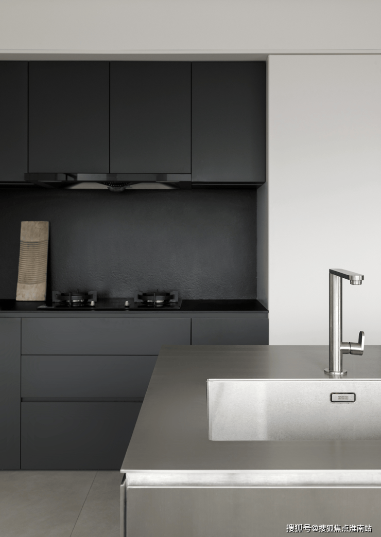 岛台一侧,黑色厨柜内设燃气灶,作为中式厨房的天地,偶尔的爆炒蒸煮都不在话下。
