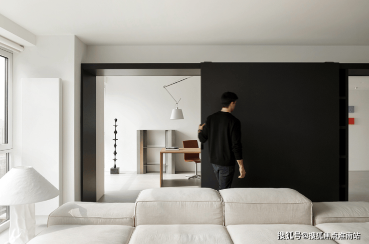 客厅沙发背后的深灰色烤漆书墙背后是书房的所在,以一扇2m长的深灰色烤漆移门控制开合,形成,形成“1+1”的可变空间组合。
