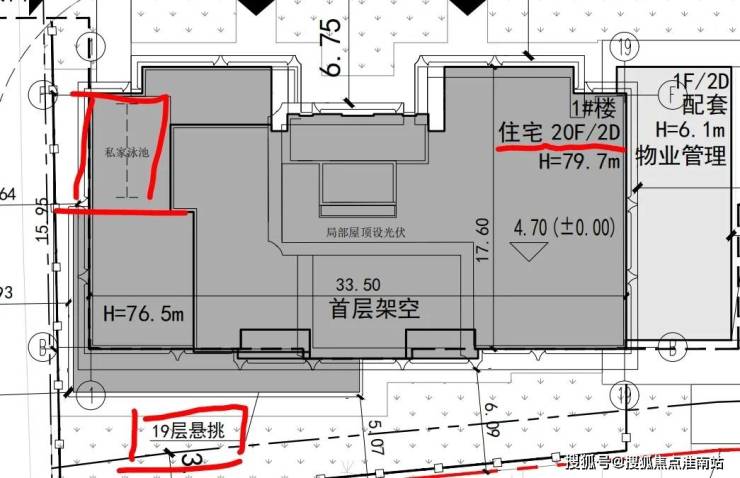 该方案亮点颇多,总计八幢高层和小高层设计,最南端的1#和2#楼均设置有私家泳池,而且还在19F采用了住宅楼当中较为少见的悬挑工艺,延伸出了一定的使用空间,个人预估这两幢会是配置大平层豪宅产品。