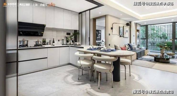 LDKB一体化设计。通过金属玻璃移门和岛台联动,达成餐厨一体,增加家庭成员互动。烟道外置以及S墙内嵌设计,优化空间布局,提升台面使用感和转角柜使用频率。