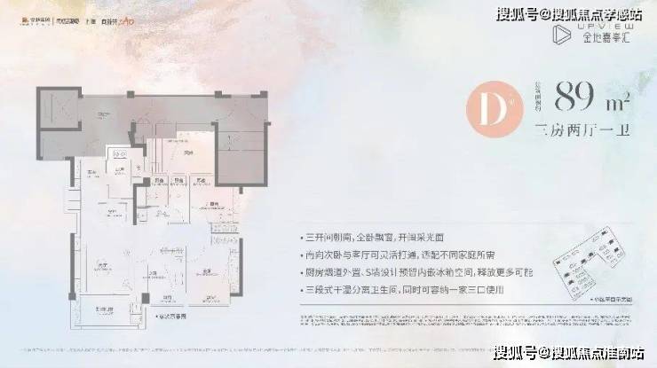 建面约89㎡三房两厅一卫(D户型),不仅功能完备,而且很好地把控了总价,约350万起即可上车高配品质三房,堪比市场上110平左右的空间感!