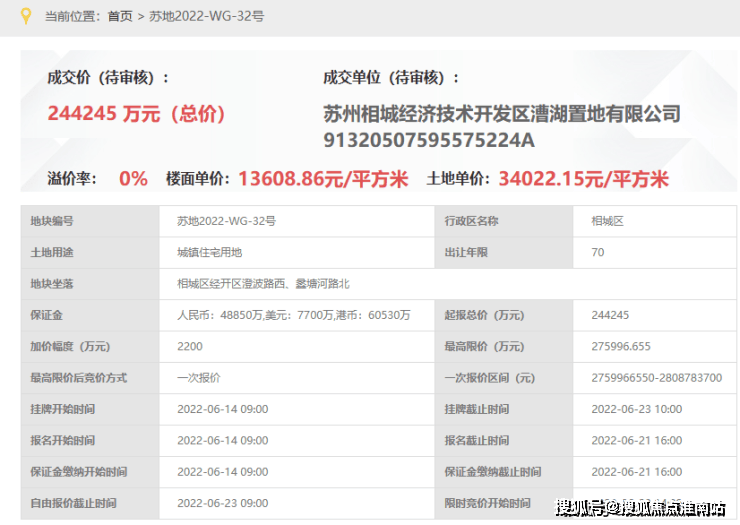 龙湖·峯云境,即苏地2022-WG-32号地块项目, 位于相城区经开区澄波路西、蠡塘河路北 ,是2022年6月23日,漕湖置地以底价244245万元竞得, 成交楼面价13609元/平 。