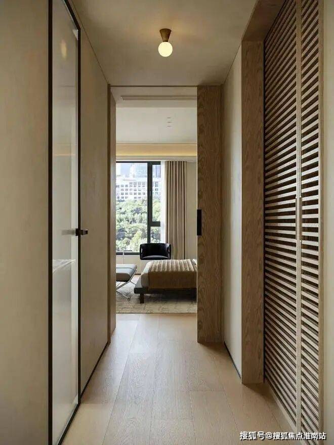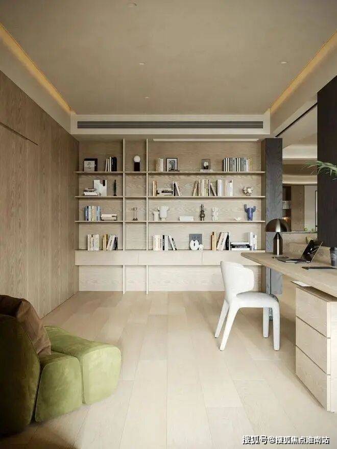 拆除卧室原有隔墙,拓宽空间尺度,引光入室勾勒家的轮廓。口袋移门隐于饰面板隔墙内,赋予书房未来独立成卧的灵活可能。温润木质书桌搭配黑色木饰面,划分功能区的同时,增添空间层次感与韵律感。共享区与多功能书房相互呼应,实现 “各享其趣,抬眸可见” 的理想互动场景。
