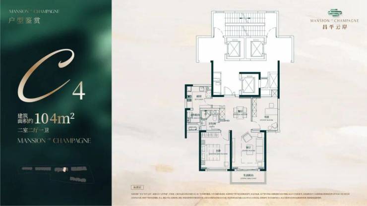 建面约104㎡2房2厅1卫户型▼