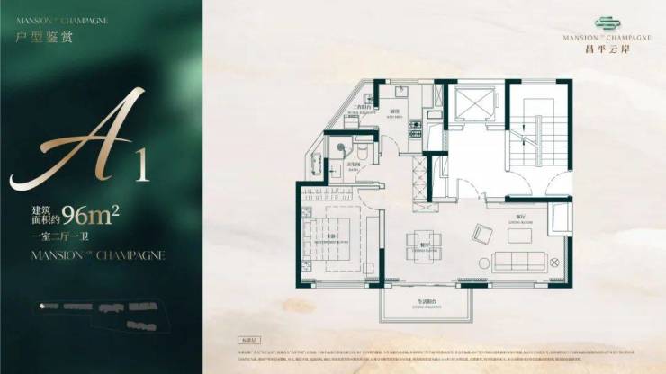 建面约96㎡1房2厅1卫户型▼