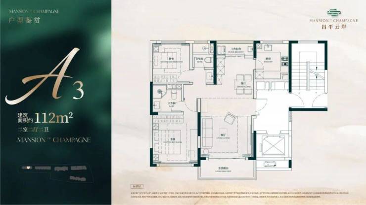 建面约112㎡2房2厅2卫户型▼
