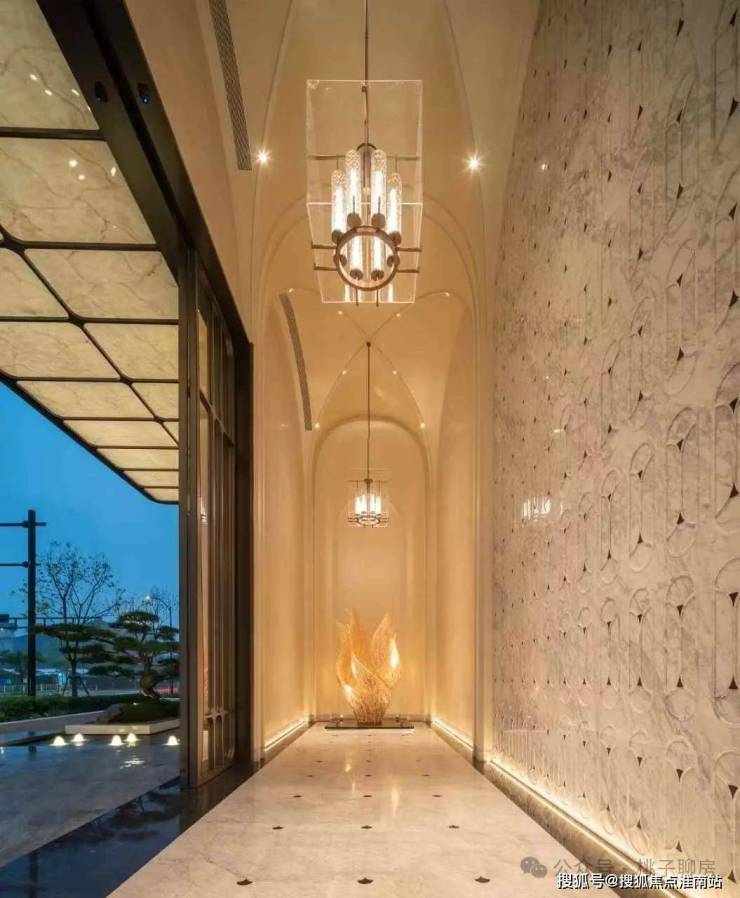 步入其中,映入眼帘的便是景观水系,灵动的水流与葱郁绿植相映成趣,沿着水系,风雨连廊曲折延伸,不仅为业主遮风挡雨,更营造出极具仪式感的归家路径。